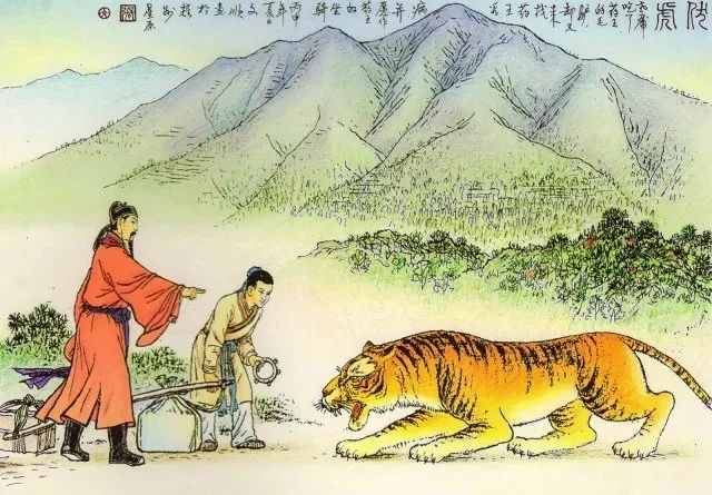 他们走了不大一会儿,忽然一只猛虎大叫一声,从松林里跑出来,直扑毛驴,用两只前爪将毛驴压倒在地,张开血盆大口,吃掉了这头毛驴。