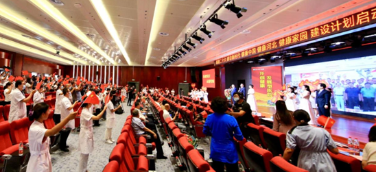 来自医院职工代表的特殊成员共同唱响《相亲相爱一家人》,他们有的是夫妻双方、或父辈母辈都是医务工作者,带动全场手挥红旗,掀起共同携手健康中国、健康河北、健康家园的参与热情。