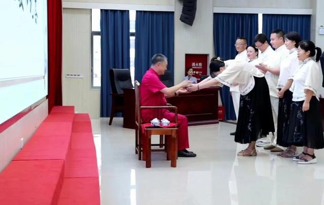 随后举行了拜师仪式,胡昌江教授上座,达川区中医医院遴选的7名师承人员恭敬地站在师父跟前,送上鲜花、敬拜师茶、呈送拜师帖、行鞠躬礼,胡昌江教授则回赠弟子医学典籍并寄语勉励。
