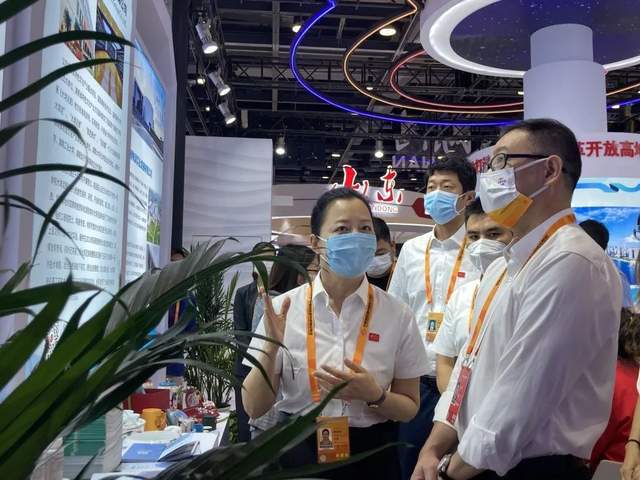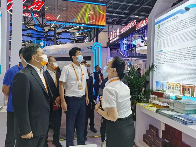 【国家商务部党组成员、副部长盛秋平(左一)参观医院展区,他指出,医院要继续以提升中医药服务能力为总抓手,积极主动提升湖湘中医药特色服务、技术、药品、产品的服务出口能力。】