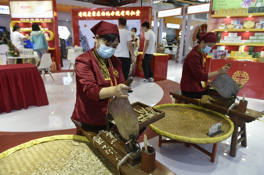 9月1日,在服贸会健康卫生服务专题展区,工作人员在展示中药材加工技艺。新华社记者 鲁鹏 摄