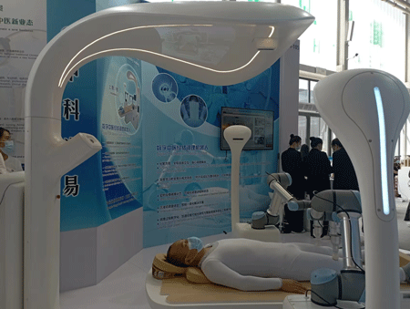记者采访中看到众多观展者都在围观一个类似“CT”的设备。中科尚易的工作人员告诉《华夏时报》记者,“眼前的设备是中科尚易研发的‘数字中医经络调理机器人’,它是基于经络腧穴理论,利用人体三维视觉追踪技术打造而成的大型数字化智能中医装备。该机器人可根据医生所开具的处方配穴,1秒内完成治疗路径规划,30分钟完成按摩调理。”记者看到,该机器人具有4个摄像头和两条机械臂,通过经络在体表的固定位置循经治疗。目前,经络调理机器人正在北京中医医院针灸科开展临床科研,未来有机会真正在临床上服务患者。