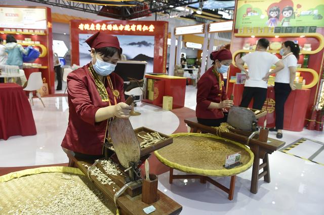9月1日,在2022年服贸会首钢园区,工作人员演示中药材加工技艺。 新华社记者 鲁鹏 摄