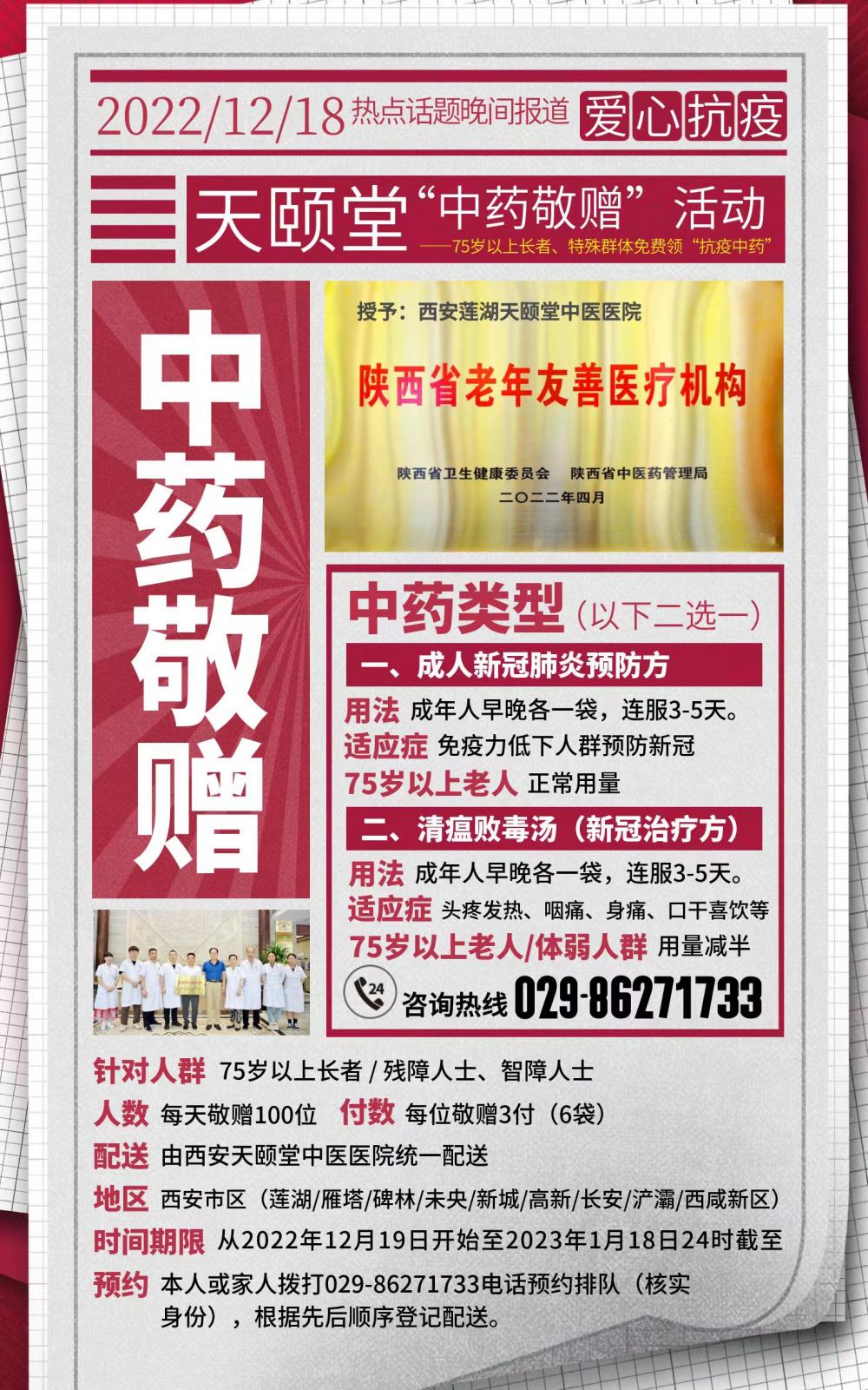 “抗疫中药”免费赠送了!西安75岁以上长者的福音!西安天颐堂中医医院“爱心抗疫·中药敬赠”活动开始,75岁以上长者、特殊群体免费领“抗疫中药”限量供应!