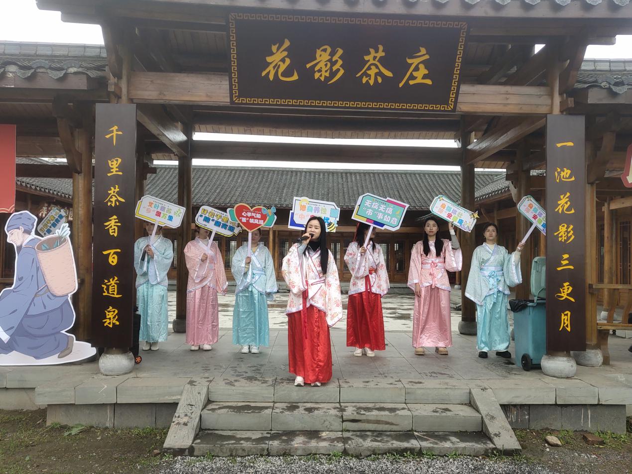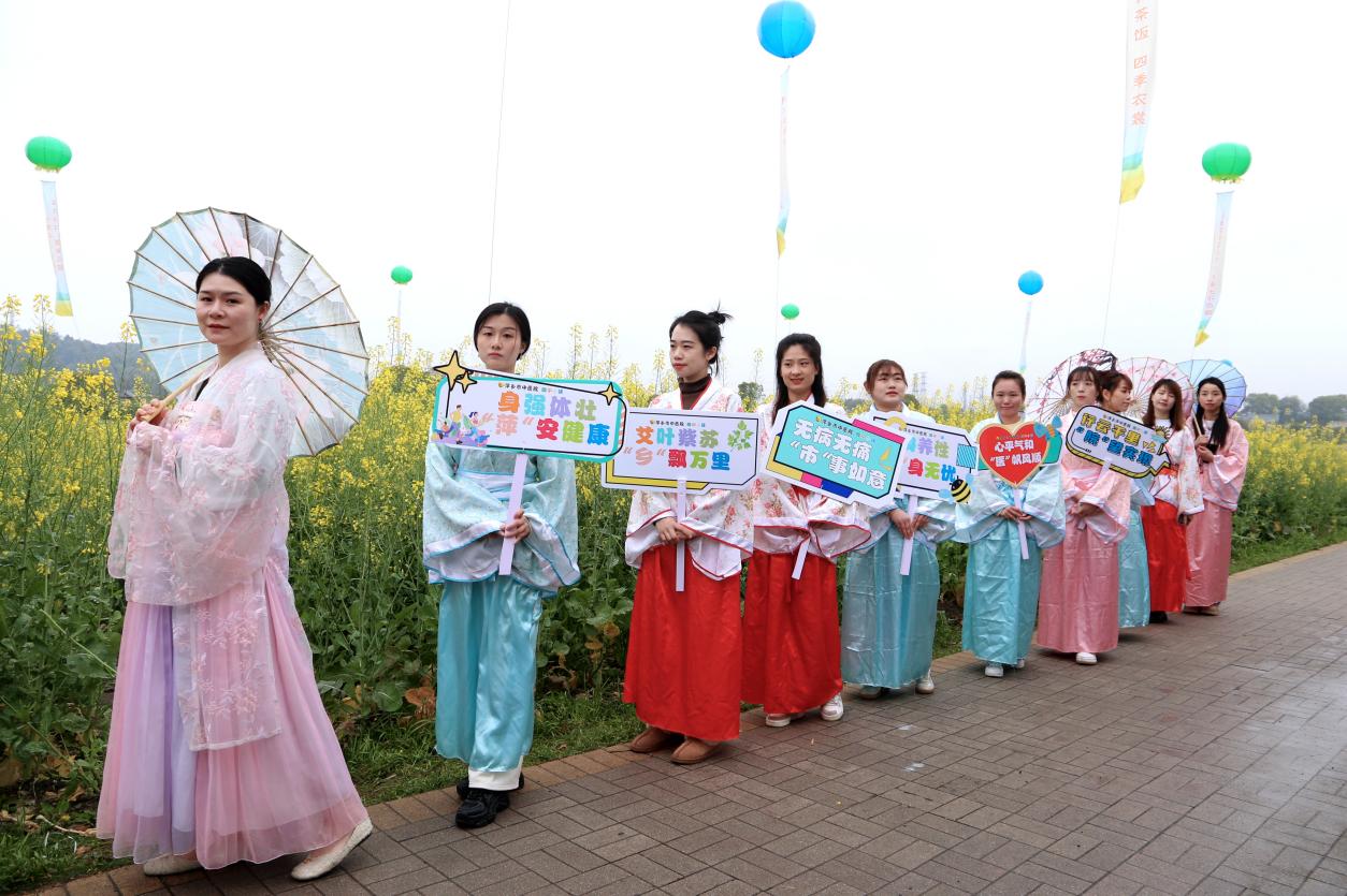“身强体壮,“萍”安健康”“艾叶紫苏,“乡”飘万里”“无病无痛,“市”是如意”“修身养性,“中”身无忧””心平气和,“医”帆风顺”……10名医护药剂人员穿着具有文化底蕴、色彩鲜亮的汉服,化身楚楚动人的“小仙女”,举着寓意“萍乡市中医院”的宣传牌轻盈地游走在花涧中,时而合影留念,时而驻步赏花,时而健康宣教,引来不少游客咨询。第一次参加此类活动的影象科放射技师贺琳珂又好奇又激动,为自己能为推广中医文化出一份力开心不已。