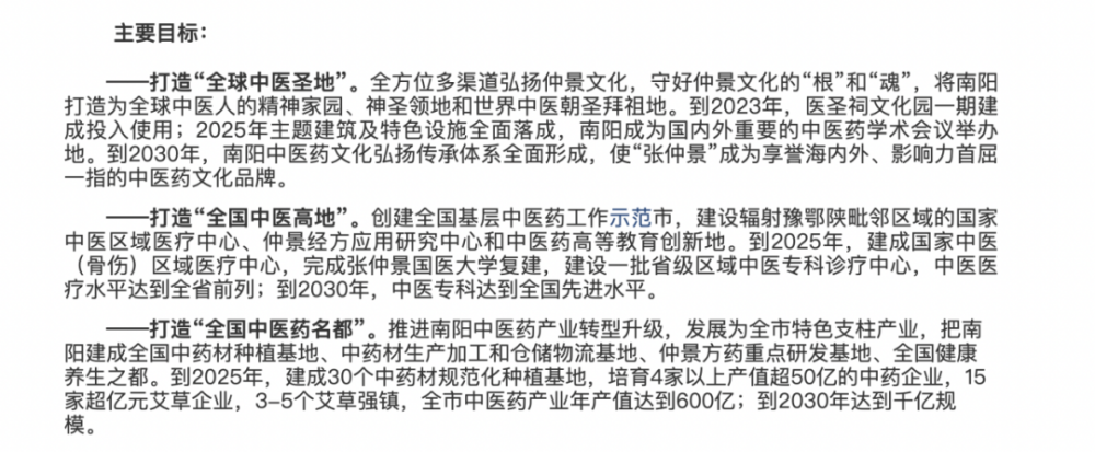 今年1月12日,南阳市又公布了《打造“全球中医圣地、全国中医高地、全国中医药名都”行动方案》(以下简称《行动方案》),将上述目标进一步细化,并提出各级党委政府要将“两地一都”作为南阳建设全省副中心城市的主要支撑进行全力支持,实行政策倾斜,并积极向国家、省有关部门寻求政策、项目和资金支持。