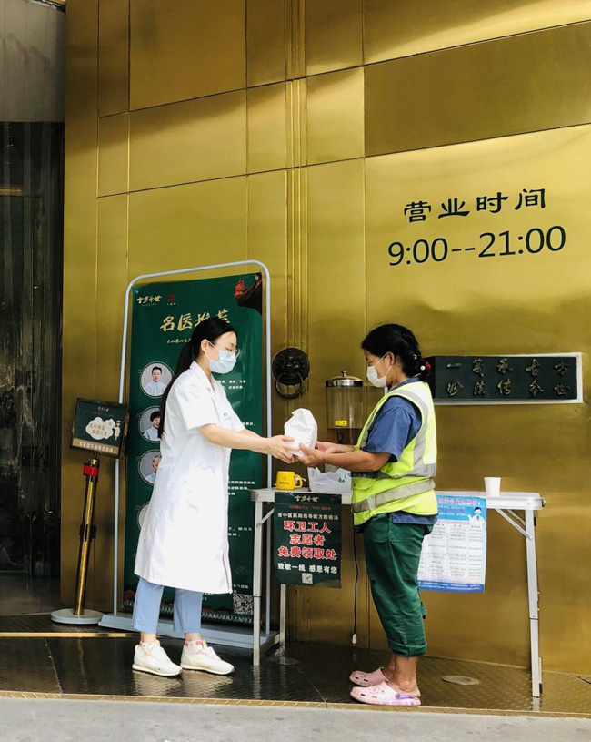 在古方今世中医馆,工作人员除了把熬制好的中医药“防疫汤”分装、打包,通过主动配送、预约定制等方式,免费为周边的抗疫一线工作人员、企事业单位、志愿者、环卫工人和社区群众提供中医药服务。来医馆领药的居民说:“虽然是免费,但是不减质,他们家熬的药用料充足、药味浓。”