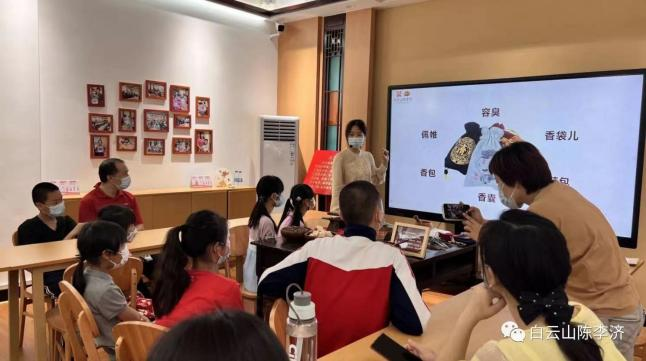 在广东革命历史博物馆,讲解员结合馆内陈李济传统中药文化展项介绍了中华老字号陈李济药店创始和发展的故事,随后在博物馆多功能室进行“陈李济陈皮中药香囊非遗体验活动”,通过药用价值、制作药材、制药工具和制作工艺等多方面的讲解介绍以及沉浸式体验活动,让孩子们亲自动手,通过称量、研磨、捣药等多种制药工艺实践,学习制作陈皮中药香囊的非遗传统技艺,受到大小观众的一致热捧。