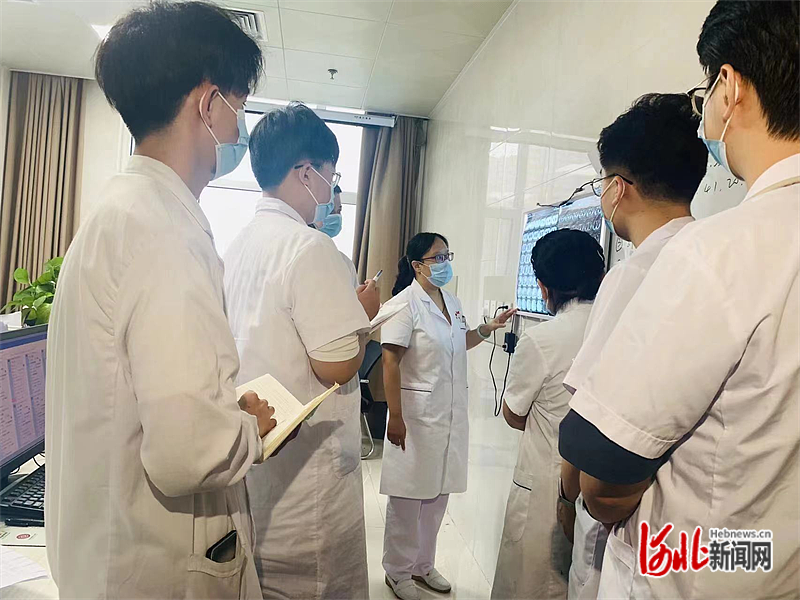 图为张蕊(左三)和枣强县中医医院肺病科的医生讨论影像特点。 田静云摄